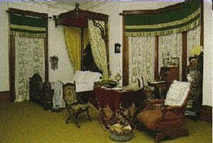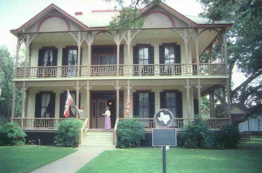 Originally a four-room cottage built in 1869 in the Greek Revival style, the home includes four fireplaces with closets built into the chimney walls. The house was later expanded into a large Victoria style home with double porches, gingerbread trim, red heart pine wainscoting, and stained glass panels in the front doors. Artifacts from after 1895 when the Brandons owned the home include Mrs. Brandon's wedding dress, and a set of furniture bought by the Brandons when they married that was used for the remainder of their life. House is filled with furniture from early Columbus families including the walnut office desk of Dr. John Byars, bookcase desk and parlor chairs of the Julius Sandmeyer family, firehouse Windsor chairs from the Alleytown, Texas, depot, and a walnut whatnot shelf from the Steiner family. Upstairs is an extensive doll furniture collection, the Eastlake Victorian bed of Marcus Townsend, a local lawyer who served in the Texas Legislature and introduced the legislation to purchase the Alamo. United Daughters of the Confederacy Cuero Heritage Museum